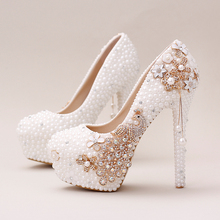 花朵珍珠水钻婚鞋超高跟防水台新娘鞋拍婚纱照水晶鞋白色细跟单鞋