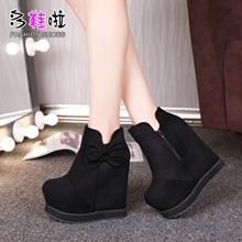 韩版性感蝴蝶结女靴厚底防水台14cm超高跟坡跟短靴内增高裸靴单靴