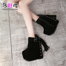 欧美16CM恨天高女鞋性感流苏绑带防水台单靴内增高超高跟坡跟短靴