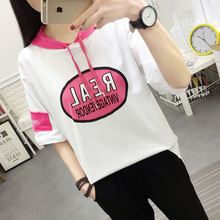 2017夏季学生宽松连帽短袖t恤韩版学院风女装拼色体恤夏装上衣女