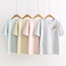 外贸原单女装 2017夏季新款宽松显瘦竖条口袋兔刺绣短袖T恤套头