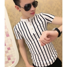 快手红人同款夏季条纹短袖T恤男士修身款半高领衣服男t恤韩版潮流