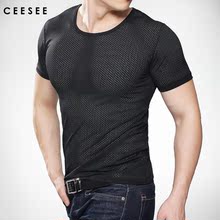 男士冰丝休闲薄款夏季圆领短袖运动健身透气镂空宽肩网眼修身t恤