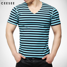 包邮男士纯棉莱卡无痕V领彩条纹半袖韩版休闲打底紧身短袖t恤