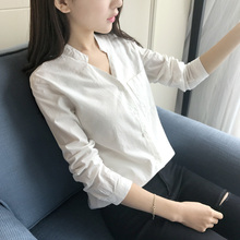 2017春装新V领厨师服长袖纯棉宽松休闲文艺小清新百搭衬衫 女