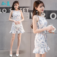 2017夏季新款女装性感名媛圆领修身荷叶边无袖高腰挂脖鱼尾连衣裙