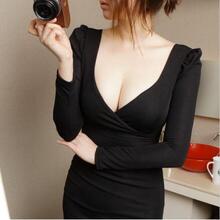 2017春秋新款性感夜店女装低胸深V领包臀紧身露胸长袖打底连衣裙
