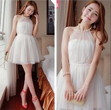 2016新款甜美女装珍珠挂脖露背公主蓬蓬网纱露肩小礼服连衣裙