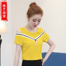 气质遮肚子露肩雪纺衫女短袖2017新款韩版小心机上衣修身显瘦小衫