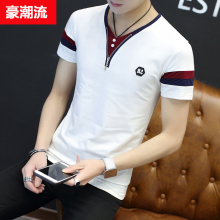 春夏季男士条纹绣标短袖T恤v领修身体恤打底衫潮大码男装小衫衣服