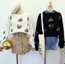 秋冬女装新款韩版小清新花朵刺绣短款宽松长袖针织衫套头毛衣上衣