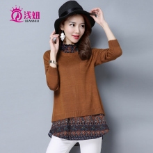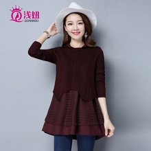 浅妞衬衫领假两件针织衫女2017潮春装中长款套头毛衣裙宽松秋外套