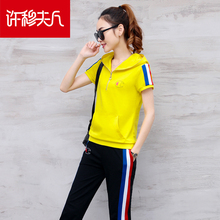 2017新款连帽运动套装女夏装短袖运动服七分裤休闲卫衣两件套