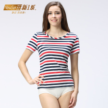新1系夏季新品纯棉透气短袖T恤女修身显瘦圆领条纹女打底上衣