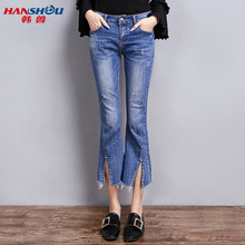 韩兽喇叭裤女春装新款韩版显瘦开叉九分牛仔裤浅色弹力微喇阔腿裤