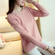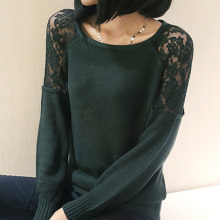 歌莱妃2017秋装韩版宽松套头后背圆领蕾丝小罩衫长袖针织衫女上衣