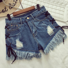 夏装新款百搭交叉系带流苏毛边短裤女夏高腰破洞牛仔裤阔腿裤学生