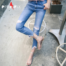 Prep&fix春夏弹力显瘦小脚做旧乞丐裤洗水浅蓝 破洞九分牛仔裤女