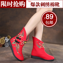 中国风刺绣棉靴绣花女靴老北京布靴子冬民族风坡跟布鞋棉鞋中筒靴