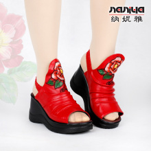 纳妮雅民族风凉鞋坡跟女士大码休闲高跟真皮中年女鞋子鱼嘴夏新款
