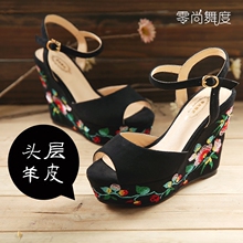 波西米亚民族风女鞋坡跟凉鞋女夏真羊皮鱼嘴鞋防水台绣花鞋高跟潮