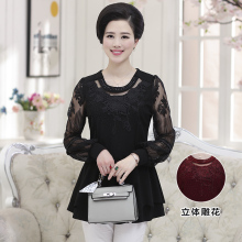 中老年女装春季打底衫圆领新款T恤长袖弹力衬衫绣花外穿纯棉秋衣