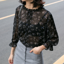 透视碎花雪纺衫女小衫2017新款学生印花木耳边系带韩版灯笼袖上衣