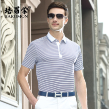 培罗蒙2017夏季新款中年男士短袖T恤 条纹修身桑蚕丝翻领polo衫