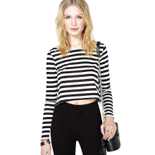 RICHCOCO欧美春夏黑白条纹上衣宽松百搭圆领短款长袖女T恤学生