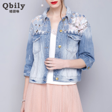 晴碧琳七分袖牛仔外套女春装2017新款潮 短款翻领镂空绣花上衣薄
