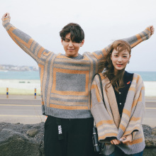 2017春装宽松撞色针织衫学生情侣装潮韩版粗棒针织长袖情侣毛衣女