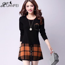 2016秋冬新款女装大码中长款针织衫 修身连衣裙韩版格子打底毛衣
