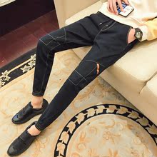裤子男春夏季韩版潮流2017破洞牛仔裤修身乞丐九分裤男生哈伦小脚