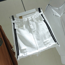 夏新款韩版白色破洞牛仔半身裙修身显瘦侧面织带A字毛边短裙C169