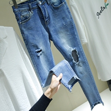 2017春夏新款洗水磨白渔网格拼接破洞弹力毛边九分牛仔小脚裤女A6