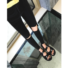 【大瓶UNIHOME定制显瘦小脚裤女夏2017新款高腰黑色破洞牛仔裤女
