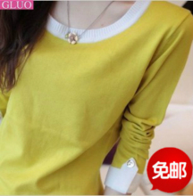 新款秋冬韩版修身女长袖娃娃领套头毛衣假两件打底针织衫短款上衣
