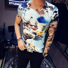 2017夏季男装短袖t恤时尚个性V领印花半袖体恤修身潮男花短袖t恤