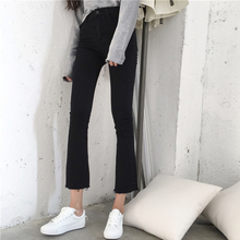 春装女装chic修身黑色喇叭裤休闲高腰牛仔裤毛边显瘦九分裤子学生