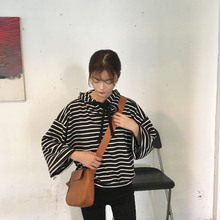 春装新款宽松显瘦简约条纹连帽套头卫衣韩版九分袖短款外套女学生
