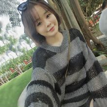 阳崽 2017早春新款 薄款镂空圆领套头毛衣宽松条纹针织蝙蝠袖