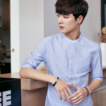 2017夏季新款休闲立领细条纹衬衫男日系文艺小清新男士五分袖衬衣