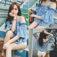 2017韩范时尚新品收腰吊带显瘦一字领夏季新款露肩雪纺衫女上衣