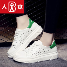 人本夏季韩版系带小白鞋女 镂空透气学生低帮鞋厚底内增高休闲鞋