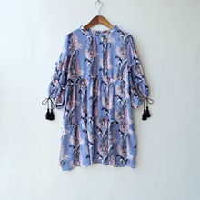 春夏新款 宽松微透海边度假风波西米亚碎花七分袖雪纺连衣裙 女
