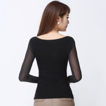 秋季新款女装 性感V领修身网纱打底衫 长袖女T恤衫 纯色纱衣