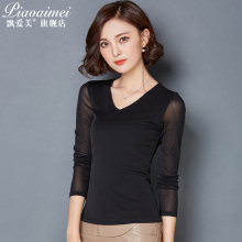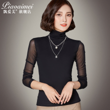 飘爱美 秋装新款大码女T恤 网纱性感拼接打底衫 修身长袖低领小衫