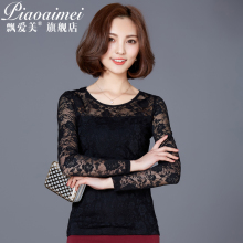 飘爱美2016秋装圆领蕾丝网纱长袖打底衫修身显瘦女士T恤小衫