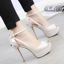 鱼嘴超高跟鞋粗跟防水台女鞋2017欧美夏季新款性感一字扣漆皮凉鞋