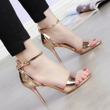 高跟鞋细跟露趾凉鞋2017欧美夏季新款性感一字扣简约百搭金色女鞋